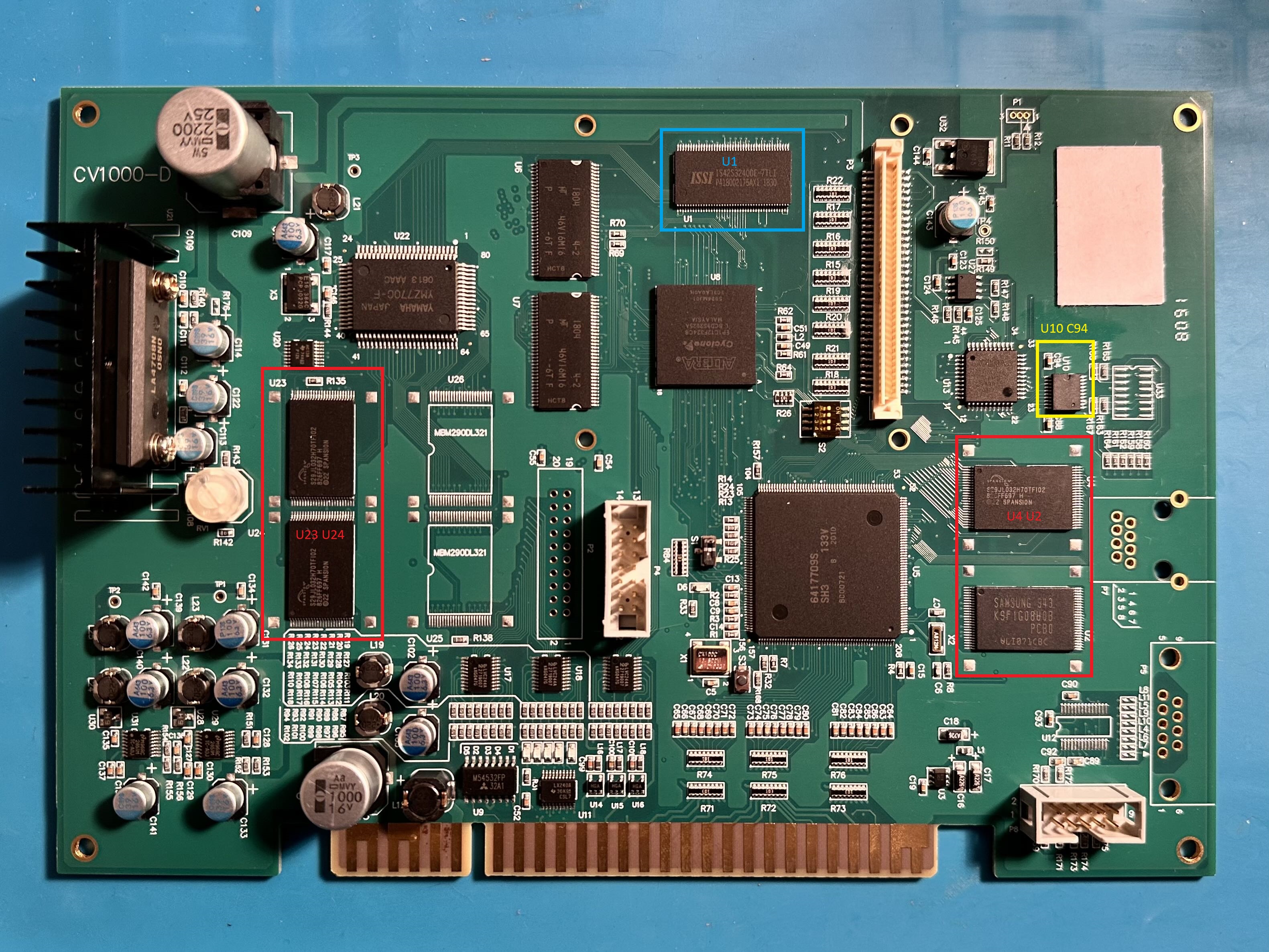 1) First thing to do is to de-solder the rom chips. You will remove 4 chips in total (circled in red):